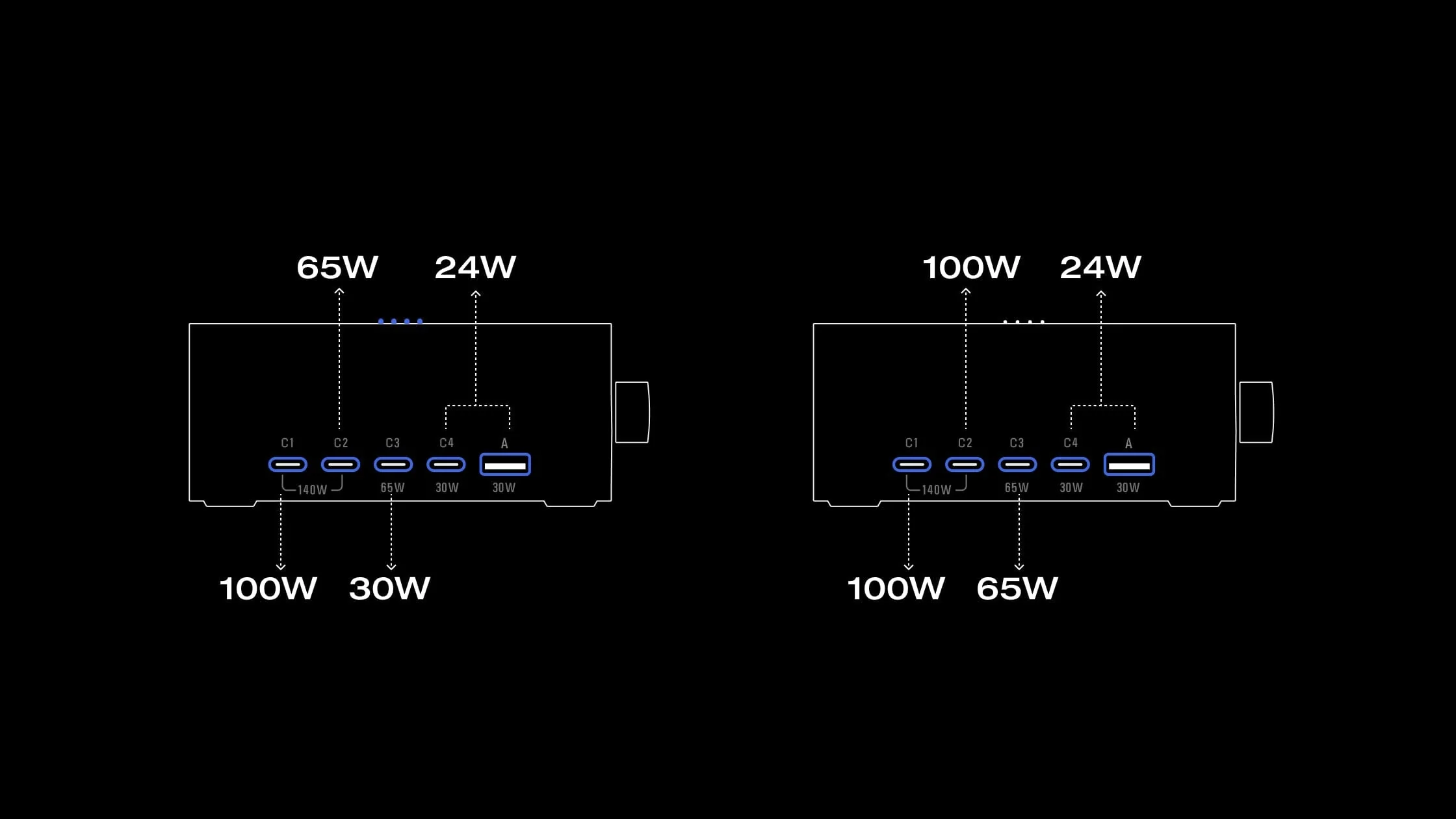 - Đầu ra USB-C: C1/C2: 140W / C3: 65W / C4: 30W