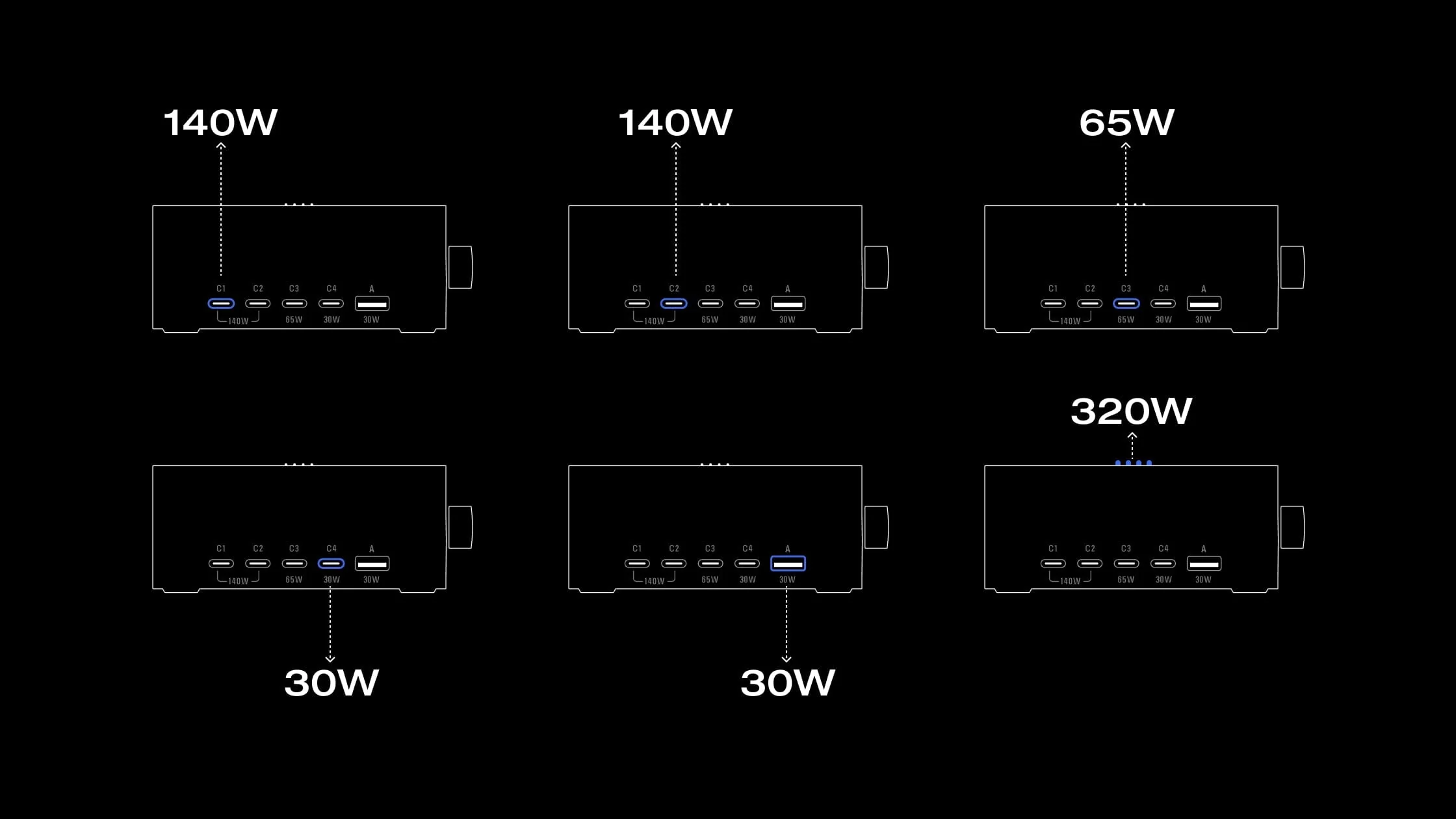 Tổng số cổng đầu ra: 4 × USB-C, 1 × USB-A, Chân cắm Pogo 320W.