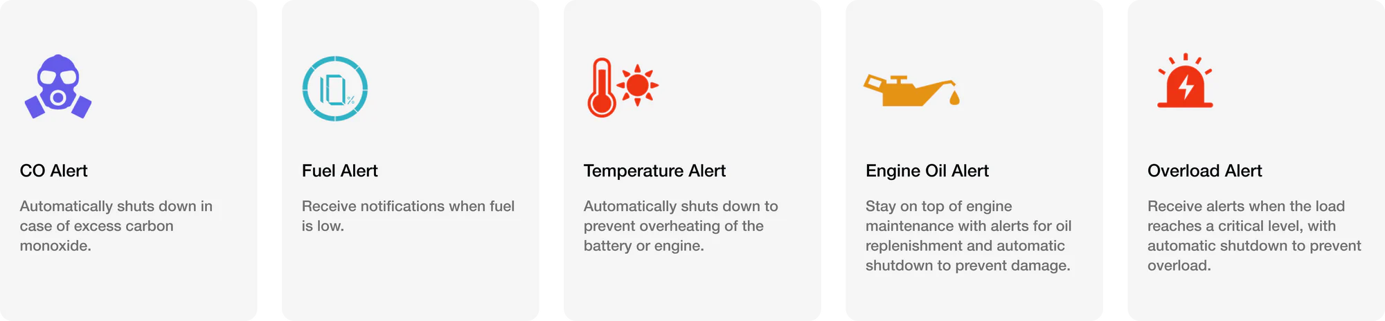 Máy được trang bị 5 cơ chế cảnh báo an toàn, bao gồm: nồng độ CO, nhiệt độ cao/thấp, mức dầu động cơ thấp, quá tải, và cảnh báo hệ thống. Các tính năng này đi kèm khả năng tự động ngắt để bảo vệ người dùng và thiết bị (ngoại trừ cảnh báo nhiên liệu). Đây là một ưu điểm lớn, giúp đảm bảo an toàn tuyệt đối trong quá trình sử dụng.