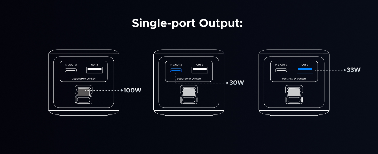 - Đầu ra cáp USB C: 10V⎓2.25A/5V⎓3A/9V⎓3A/12V⎓3A/15V⎓3A/20V⎓5A Tối đa 100W