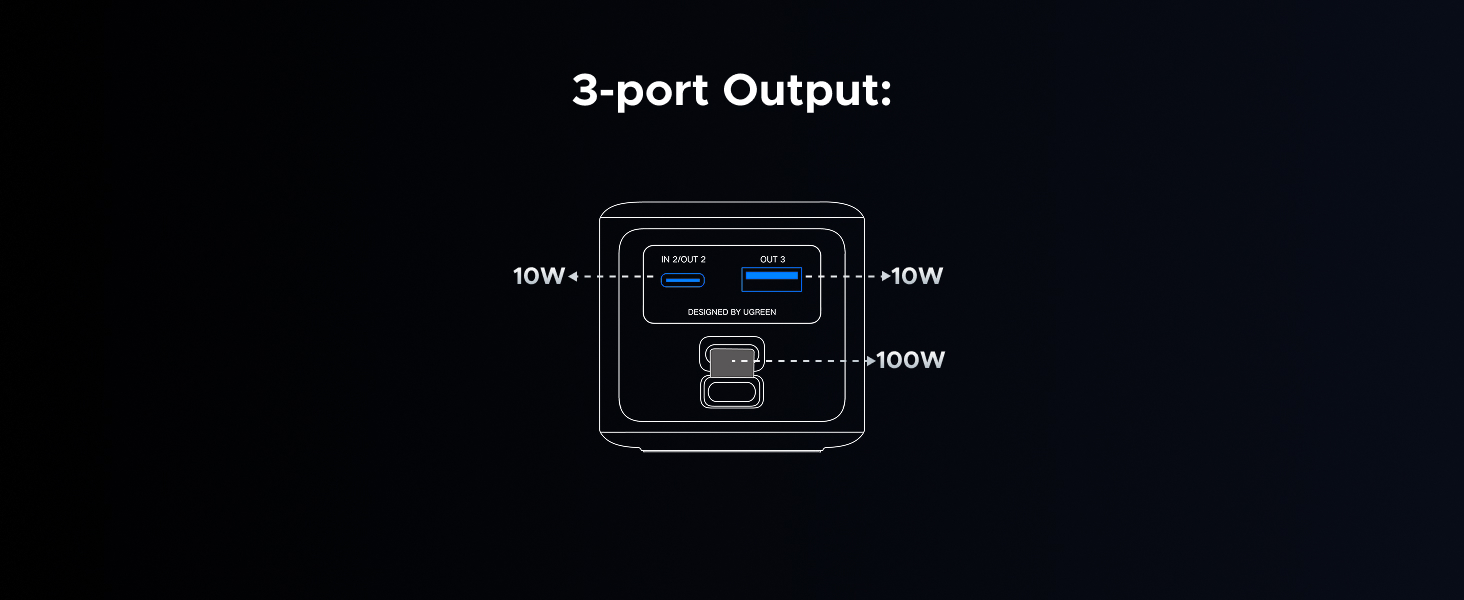 - 3 cổng sạc thông minh: 2 USB-C, 1 USB-A – Sạc 3 thiết bị cùng lúc.
