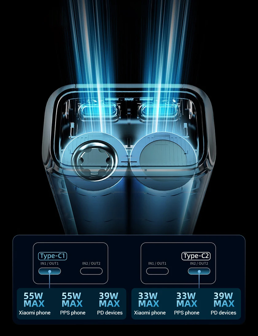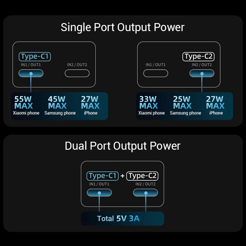 - – OUT1(Type-C1): 5V–3A, 9V–3A, 12V–2.5A, 15V–2.6A, 5-11V–6A, 5-20V–2.5A, 55W MAX.