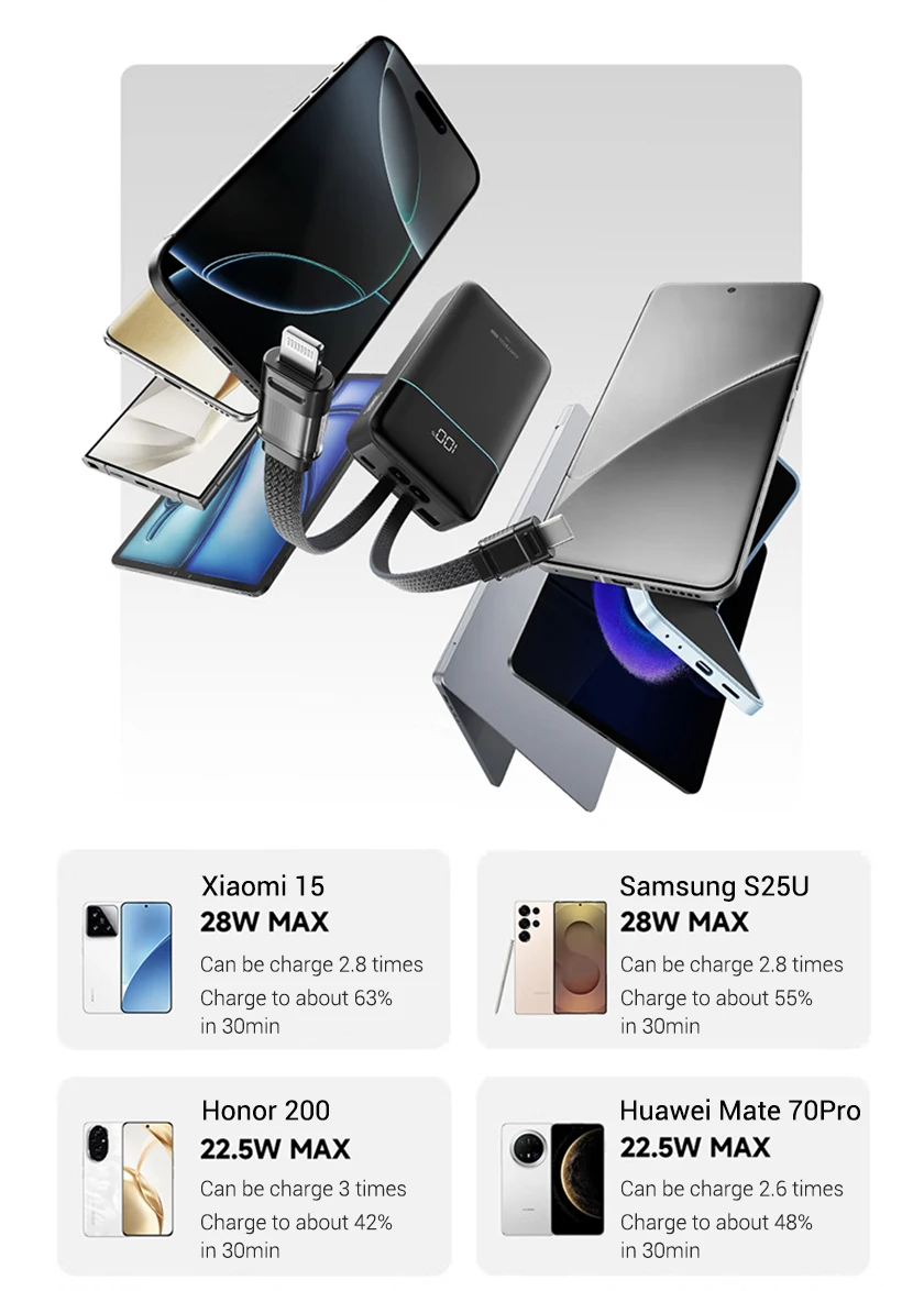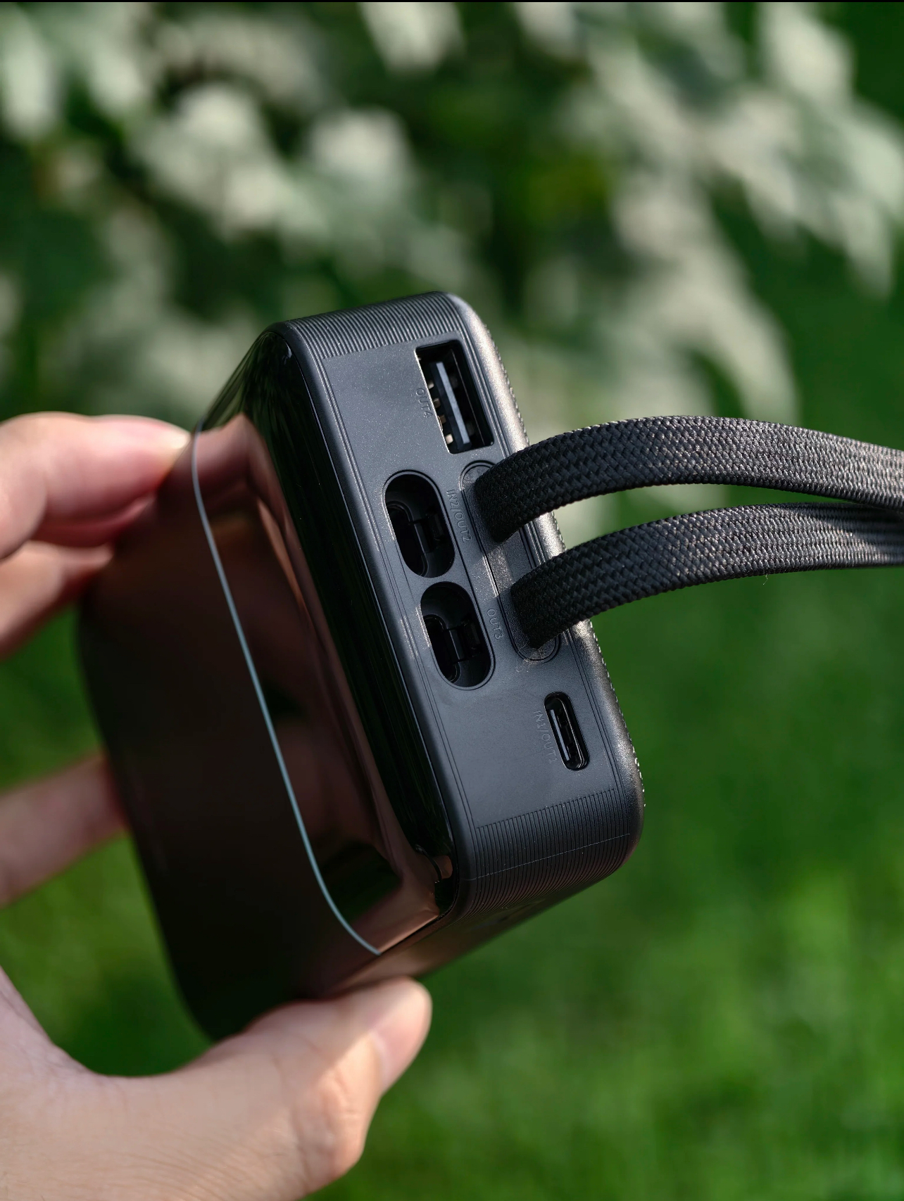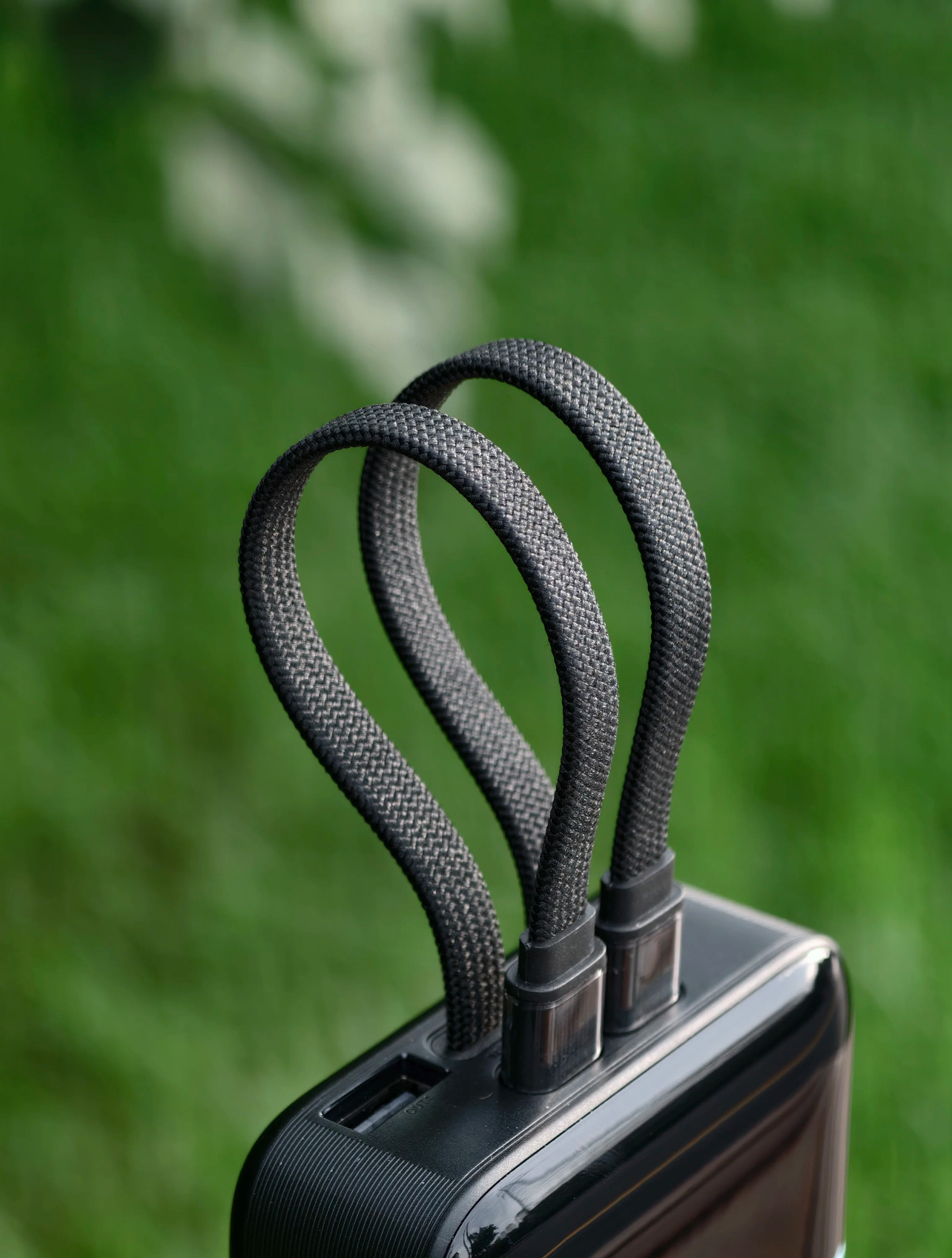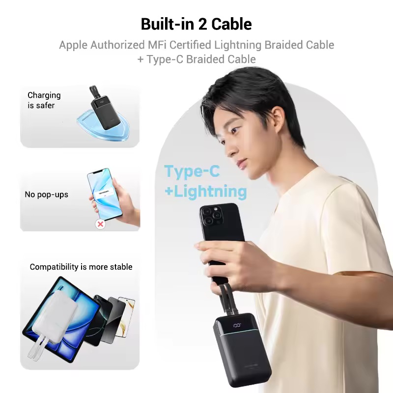 - Cáp sạc tích hợp tiện lợi: Có sẵn Type‑C và Lightning MFi, bện 48 sợi chắc chắn, không lo quên dây.