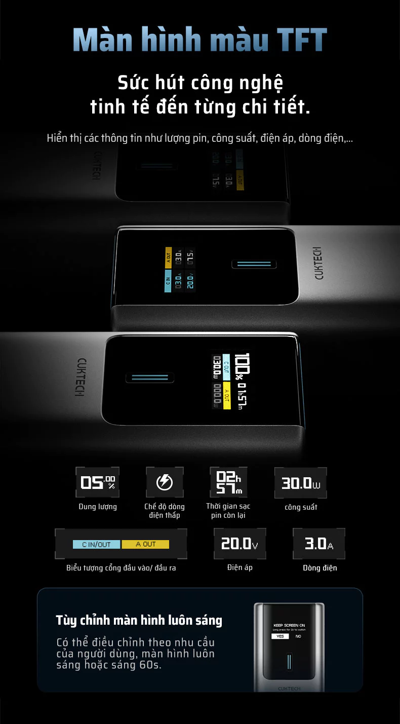 Một điểm nổi bật không thể bỏ qua trên Cuktech No.10 Power Bank 150W chính là màn hình TFT màu sắc nét, giúp hiển thị đầy đủ và chi tiết các thông số kỹ thuật quan trọng trong thời gian thực.