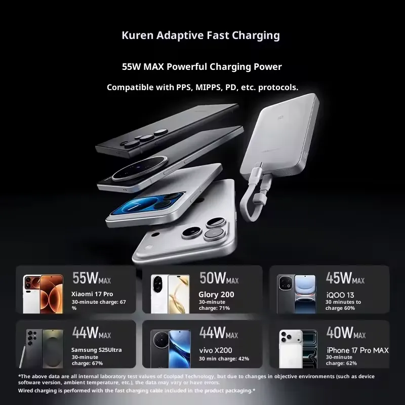 So với các mẫu Pin Dự Phòng Cuktech hoặc pin nam châm phổ biến chỉ hỗ trợ 22.5W, Pin Dự Phòng Cuktech No.10 Super Magnetic nổi bật với công suất sạc có dây tối đa lên đến 55W.