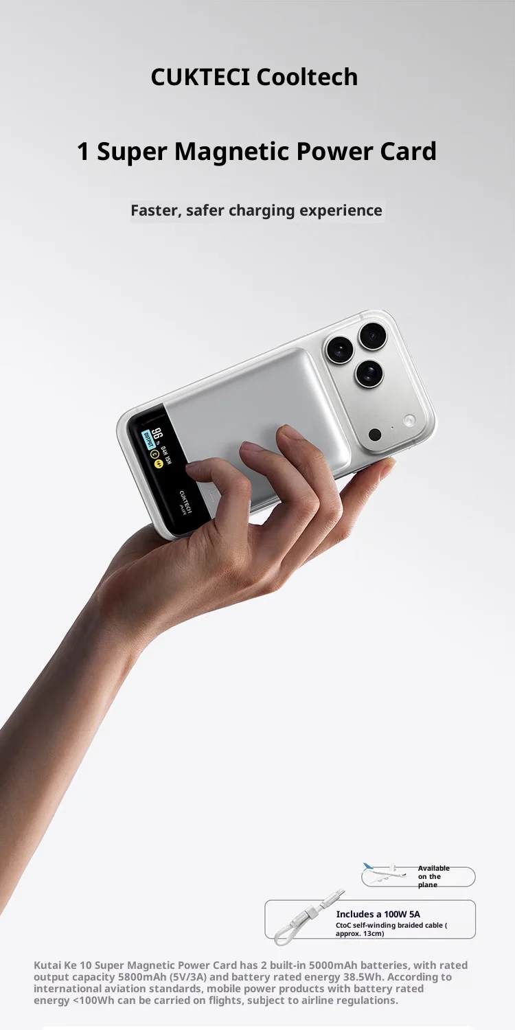 Pin Dự Phòng Cuktech No.10 Super Magnetic Power Card 10000mAh 55W – WPB100P là mẫu pin flagship mới nhất trong dòng Digital Series của CUKTECH. Sản phẩm định nghĩa lại trải nghiệm sạc nhanh từ tính (Magnetic Fast Charging) với kích thước nhỏ gọn, hiệu suất cao và công nghệ sạc thông minh tiên tiến. Đây là pin sạc dự phòng chọn hoàn hảo dành cho người dùng yêu thích sự tiện lợi, tốc độ và thiết kế tối ưu.
