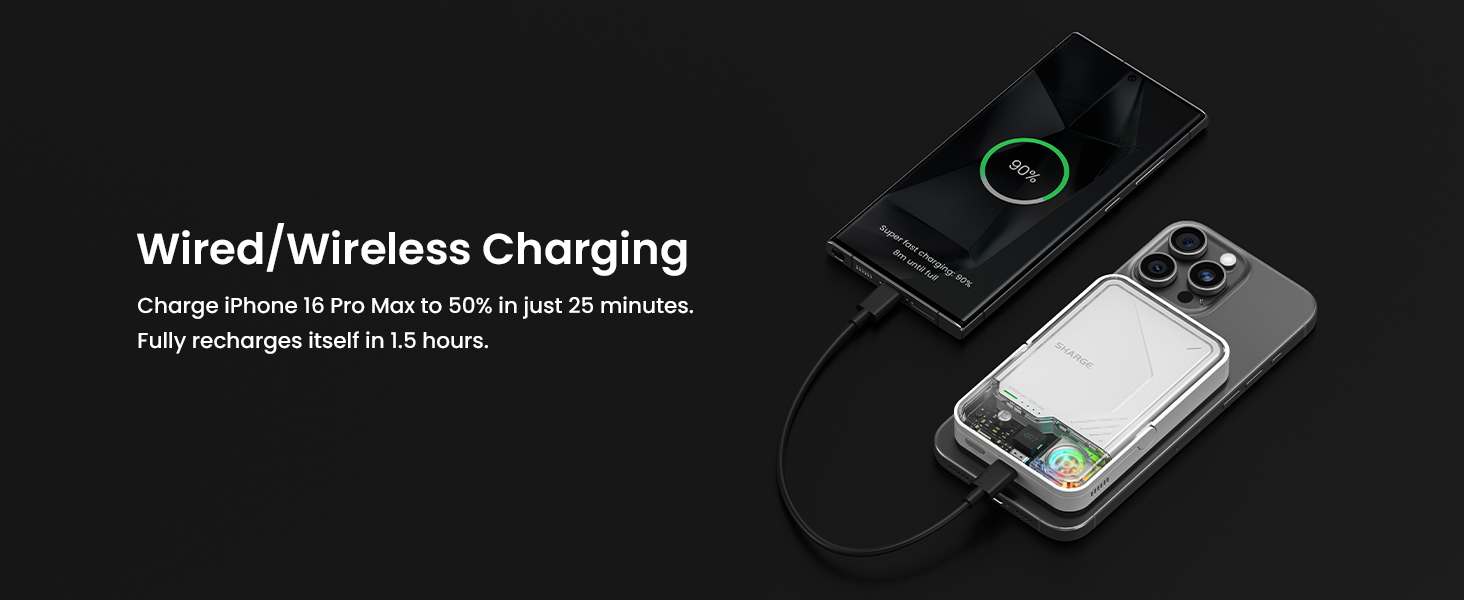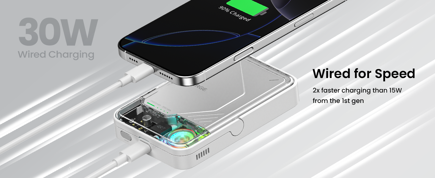 Ngoài khả năng sạc không dây vượt trội, Shargeek ICEMAG 2 còn hỗ trợ sạc có dây với công suất lên đến 30W, phù hợp để sạc nhanh cho MacBook Air, iPad và các dòng điện thoại cao cấp. Thiết bị hỗ trợ sạc hai chiều, nghĩa là vừa có thể sạc cho thiết bị khác, vừa có thể sạc lại chính nó nhanh chóng thông qua cổng USB-C.