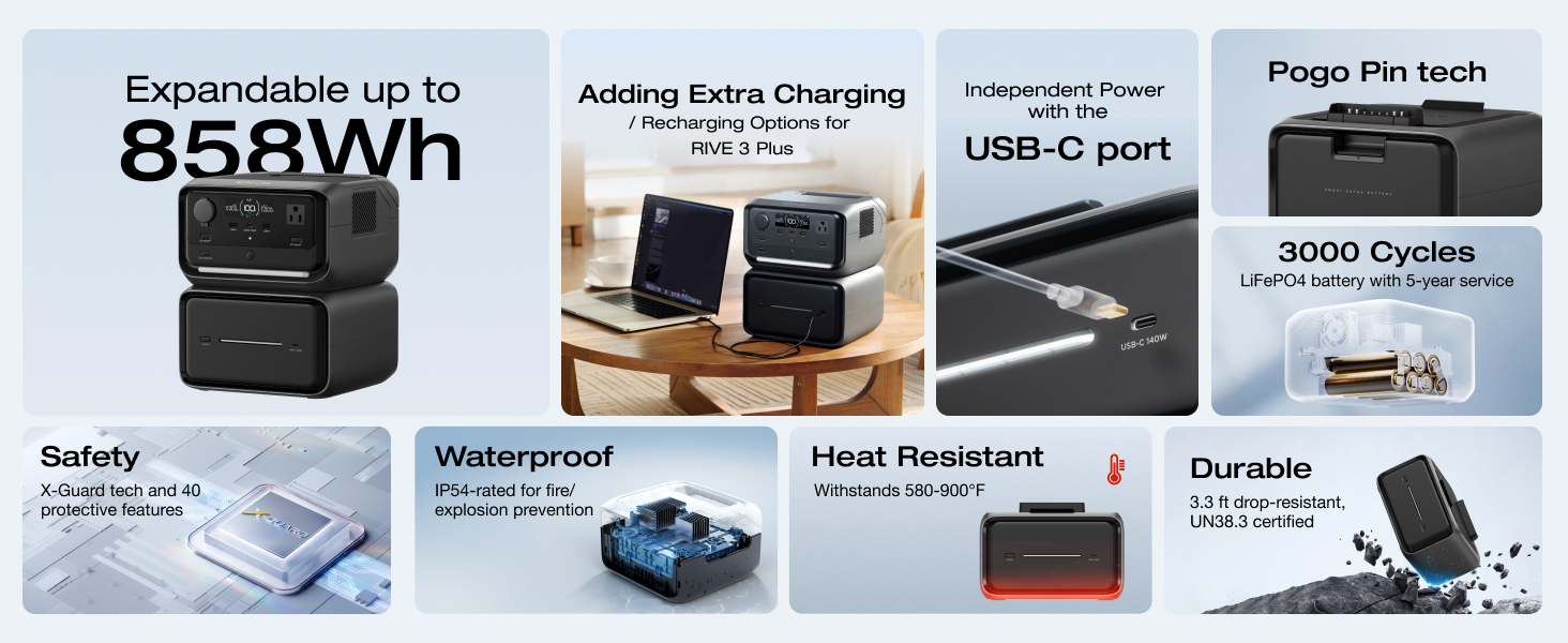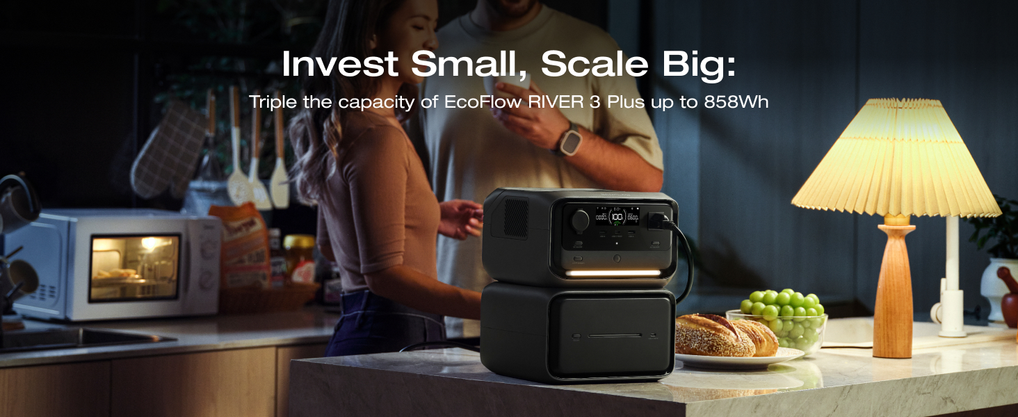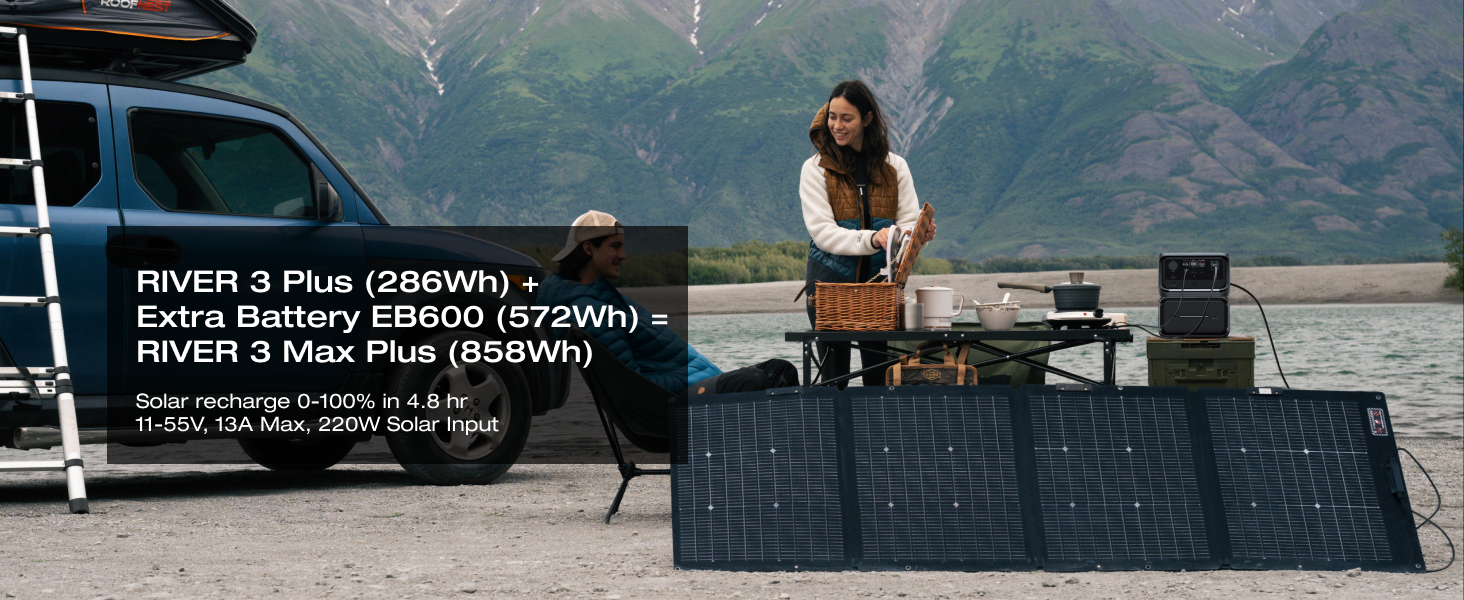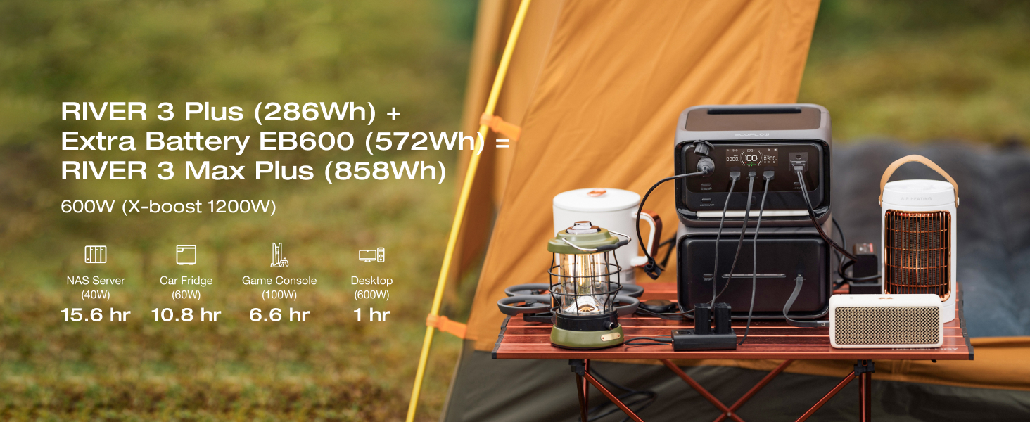 Khi kết hợp Pin EcoFlow RIVER 3 Plus Extra EB600 với trạm chính RIVER 3 Plus, người dùng có ngay tổng dung lượng lên đến 858Wh – giúp kéo dài thời gian sử dụng cho nhiều thiết bị khác nhau: từ tủ lạnh ô tô, ấm đun siêu tốc cho đến các thiết bị văn phòng di động.