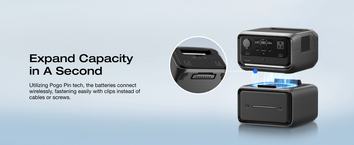 Sử dụng công nghệ kết nối Pogo Pin thông minh, việc gắn kết pin mở rộng trở nên cực kỳ nhanh chóng và đơn giản. Không cần dây cáp hay công cụ hỗ trợ, người dùng chỉ cần thao tác trong vài giây là đã có thể sẵn sàng sử dụng.