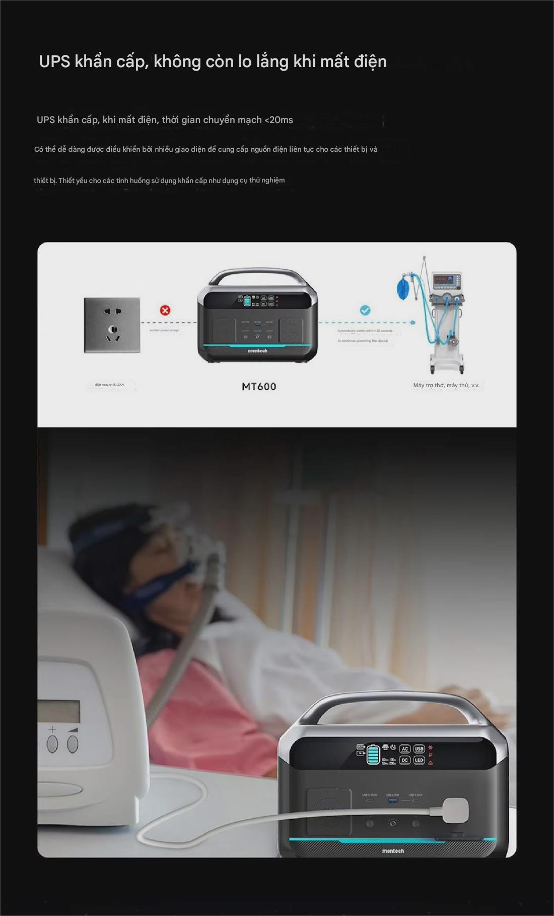 Trạm sạc di động Mentech MT600: công suất 600W (đỉnh 1200W), dung lượng pin 307Wh, phù hợp cứu hộ hoặc hỗ trợ nhiều thiết bị cùng lúc.