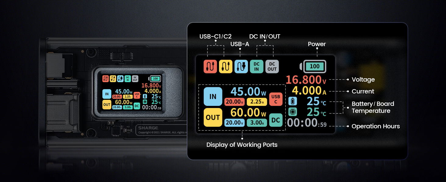 Một trong những điểm sáng giá của Pin Dự Phòng Shargeek 100W Storm 2 – STM2-2 chính là màn hình LED tích hợp hệ điều hành mini. Không giống như các dòng pin sạc thông thường chỉ hiển thị phần trăm pin, Storm 2 cung cấp giao diện trực quan để theo dõi: