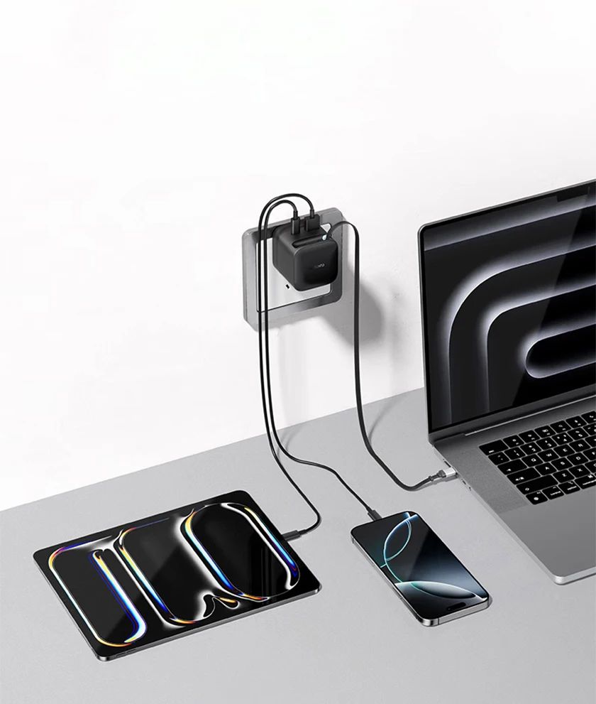 Với ba cổng kết nối (2 USB-C và 1 USB-A), bộ sạc cho phép sạc cùng lúc nhiều thiết bị với tổng công suất tối đa 67W, tối ưu thời gian và nâng cao trải nghiệm sử dụng.