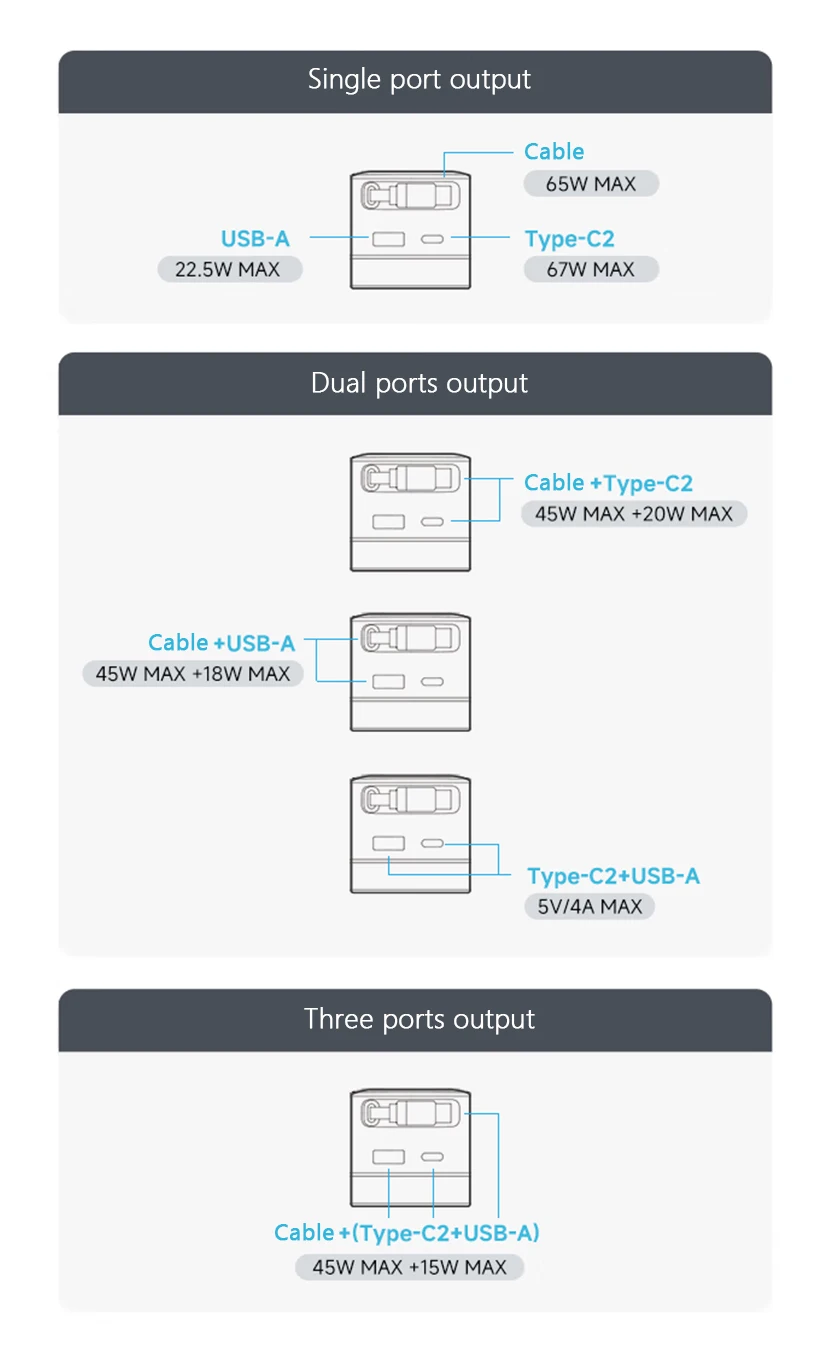USB-C2: 5V⎓3A, 9V⎓3A, 11V⎓6.1A, 12V⎓3A, 15V⎓3A, 20V⎓3.25A → Tối đa 67W