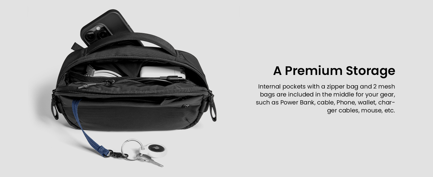 Ngăn chính rộng rãi, đi kèm một túi có khóa kéo và hai ngăn lưới giúp lưu trữ gọn gàng các vật dụng như sạc dự phòng, cáp sạc, ví, chuột, tai nghe, điện thoại.